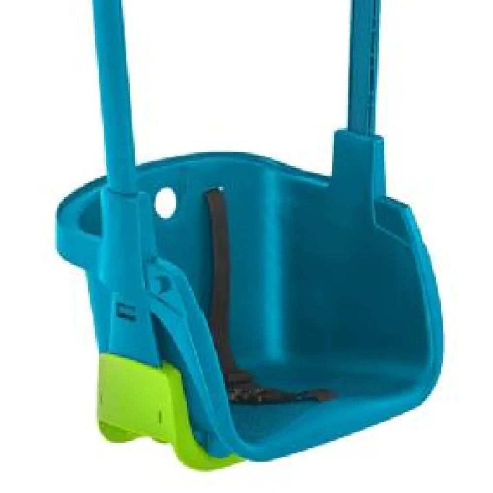A 4 in 1 seat, start this seat as a baby seat with a high back and safety harness, then as your child grows (with a bit of assistance from a helper), remove the higher back, then the front and finally you have a small swing seat. Can be used with the lower height TP frames as well as full height frames. Colours may vary and be lime green and turquoise. Please contact us if your require a specific colour. Age 6 months to 8 years
