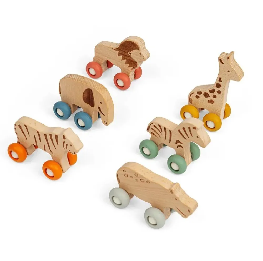Chunky wooden animals on smooth running wheels to whizz along the floor or be handles and chewed. In natural wood with detail and coloured wheels.