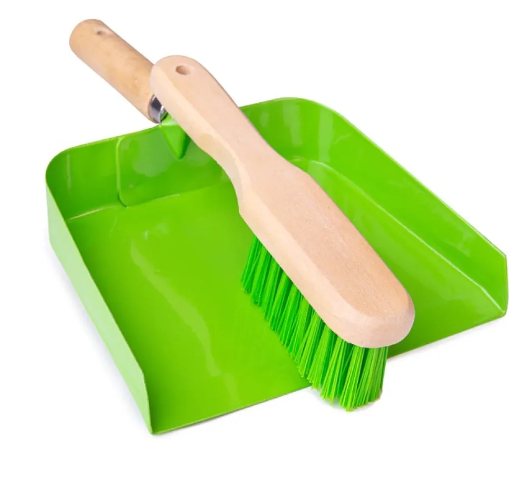 A strong metal dustpan with a good even slope on the front and a wide mouth to make it easy for little ones to use and tidy up. It has astrong short wooden handle for little ones to manage heavy loads that the have scooped up.