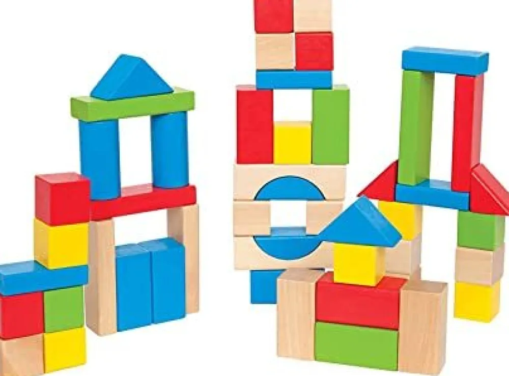 A set of 50 colourful wooden building blocks in their own storage bag.