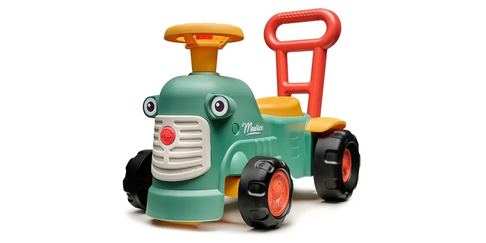 A scoot along tractor with working steering wheel and horn, this little tractor is also a walker with a sturdy handle to help balance little ones. The seat lifts up to store prize possessions or anything they cant hold and drive with at the same time.