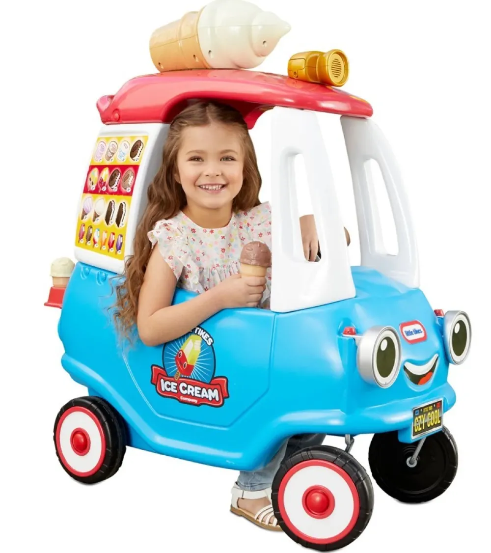 The iconic Little Tikes Cozy Coupe has been reimagined as a modern-day Ice Cream Truck that can be parent pushed or kid powered. Use the convenient handle to push the truck or remove the floorboard and let your child take control and power the ride themselves. The truck plays modern ice cream truck music by RZA, which will make you quite cool in the neighbourhood.