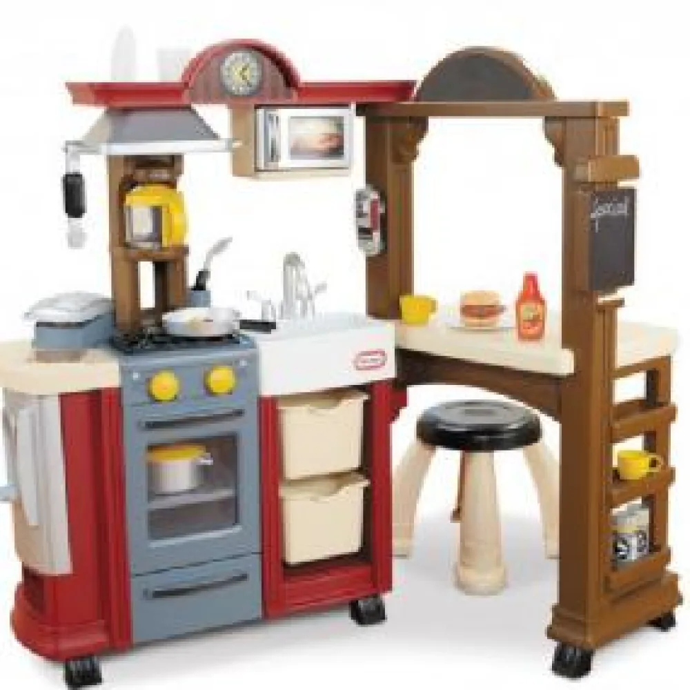 Dinner is served in the Little Tikes Kitchen Restaurant with Rotatable bistro dining area. The kitchen has a variety of appliances including panini press, coffee maker, working doors, stool, ice maker, clips above stove for orders, phone and credit card swipe The set comes with 38 accessories, including coffee pot, assorted food and plenty of dishware to serve your guests.