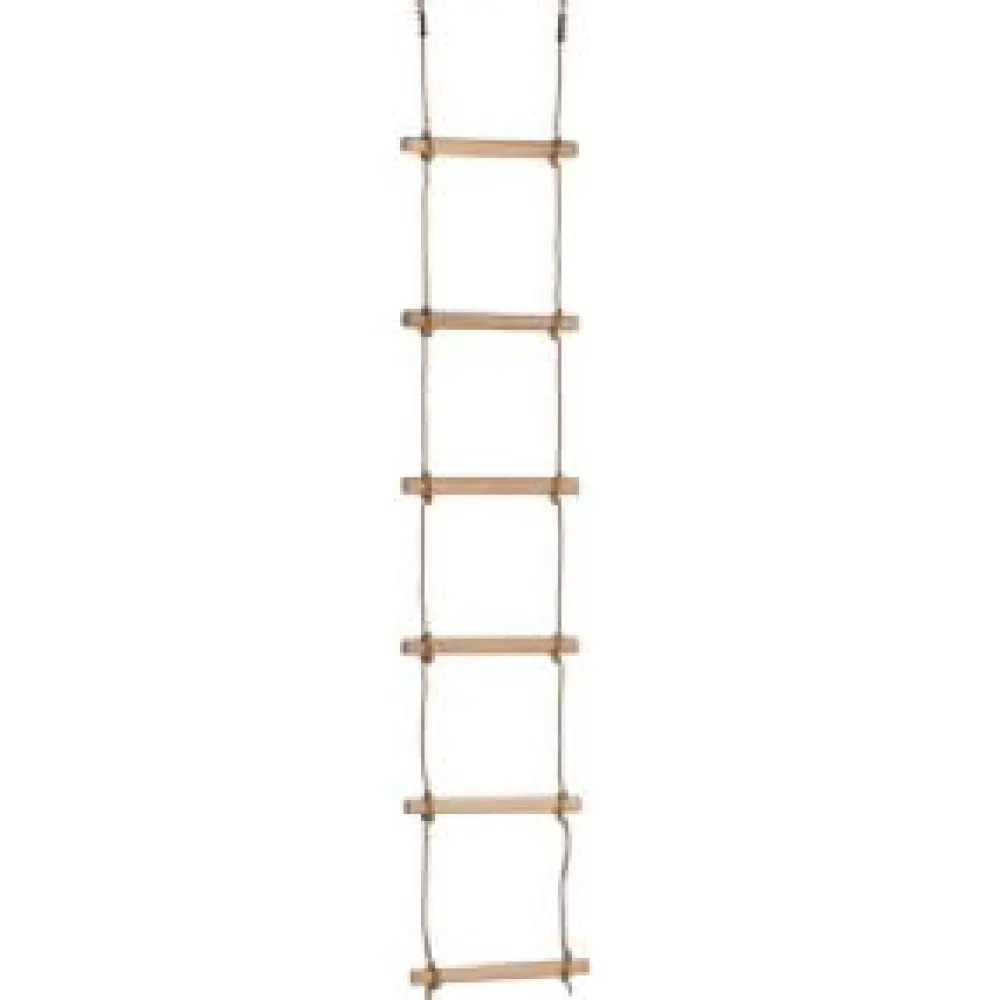 A wooden 6 rung rope ladder with a single suspension point, and galvanised steel ring to fasten to an opening shackle or hook on your frame intended to be 2.25m high. The rope ladder is 2.10m long, with 6 hardwood rungs 35cm apart, (rung diameter 35mm, length 400mm).Poly hemp rope