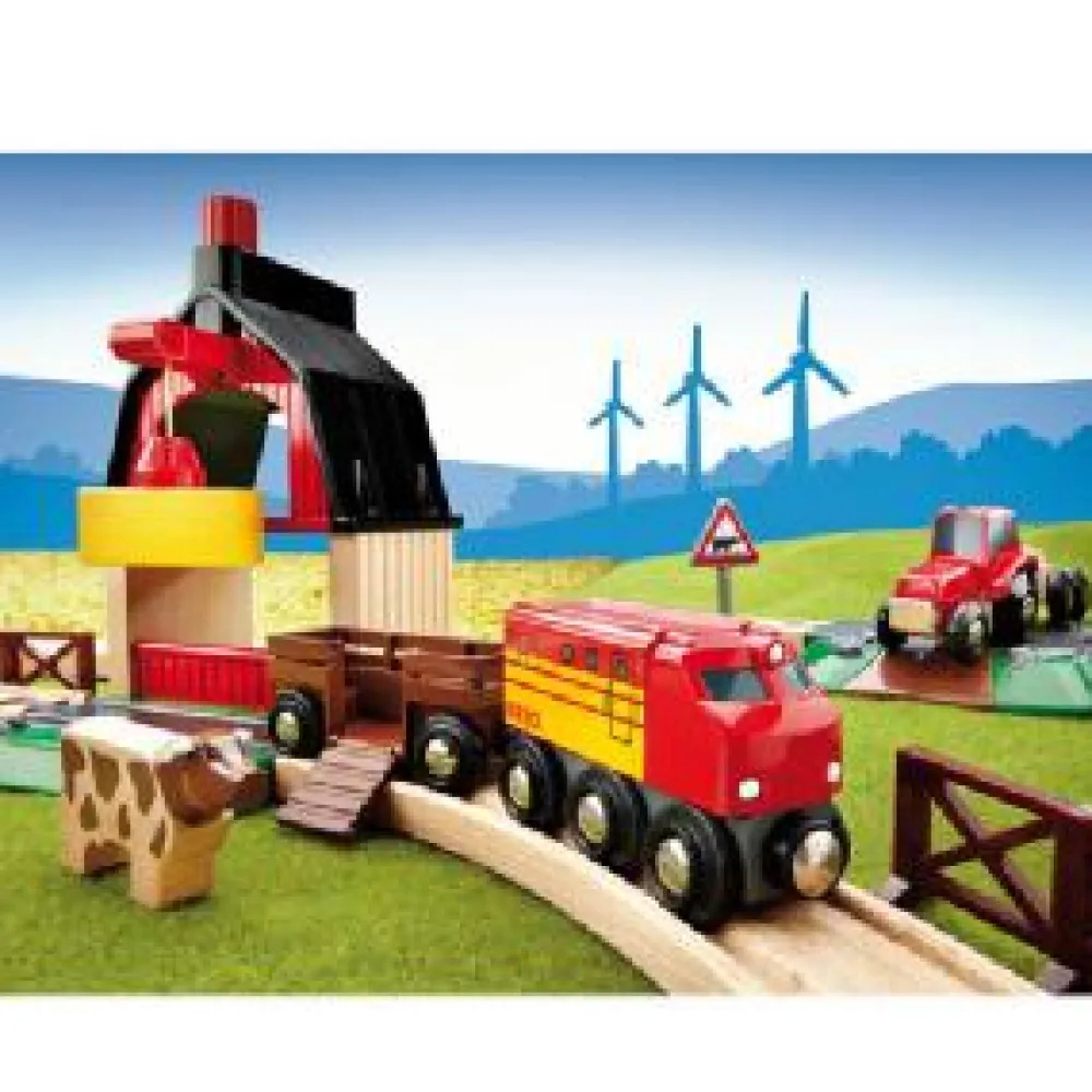 This oval train track lets you start your Brio collection or add it to track you already have, the set is part of the farm range and allows you to lead bales in from the field to the shed and then load them onto the train or maybe the train delivers the bales to the farm! When the train and carriage pull up, turn the button on the top of the shed to lower the magnet onto the bale, and then lift it, before sliding the button across and taking the bale into the shed to either stack it or lower it onto the waiting trailer. The set contains, track, engine and carriage, road crossing with sign, fencing, cow, tractor and trailer, shed and bale. Age 3+