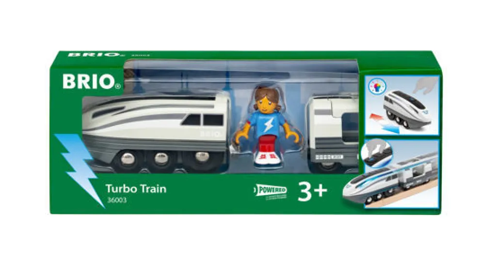 This Battery operated train has a large turbo button, doubling its speed, this super speed lasts for 5 seconds and as its running at top speed the white lights along the sides of the engine turn to cool blue, making it even more impressive.