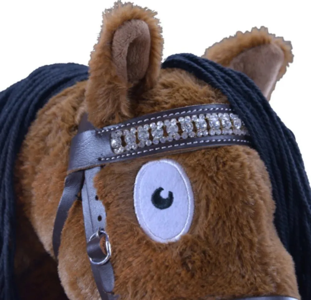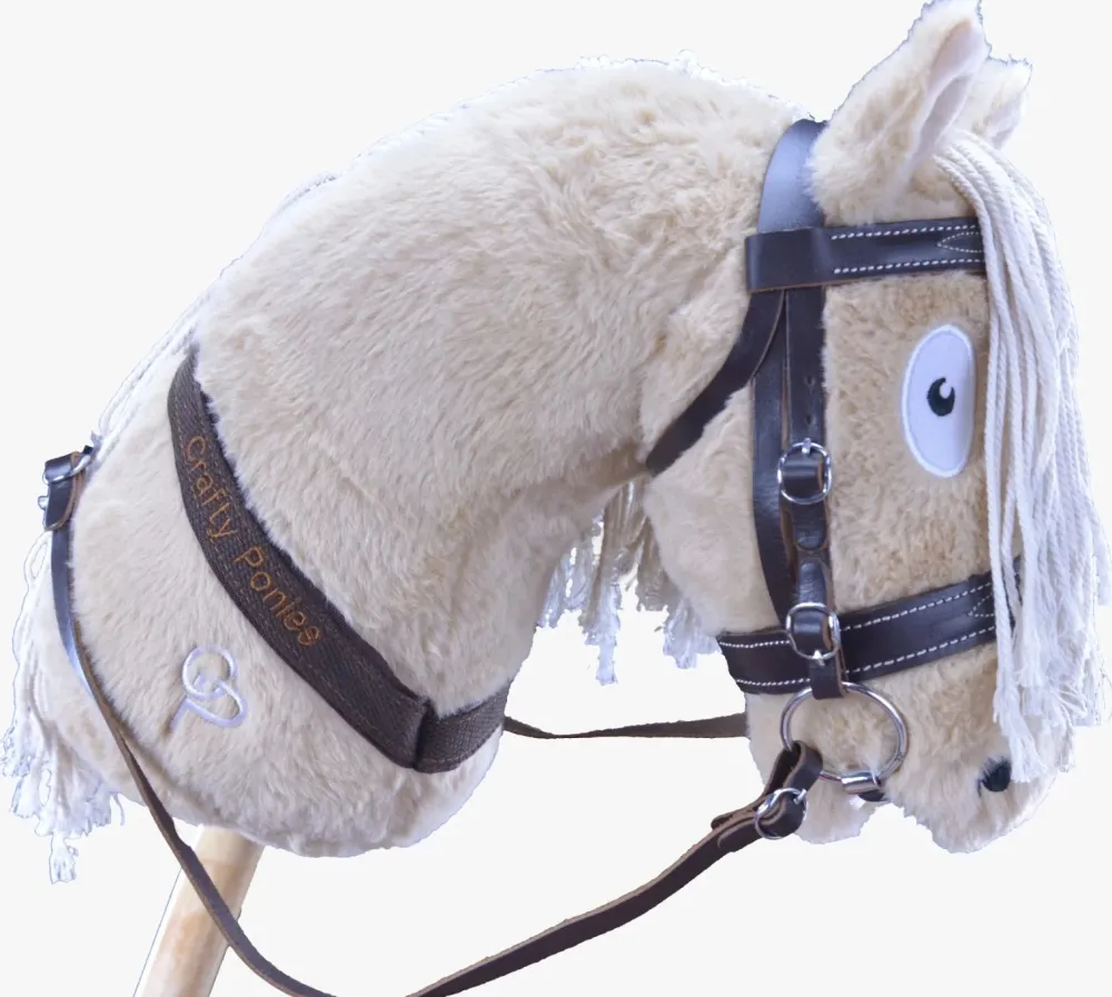 A leather bridle with detailed white stitching for your Crafty Ponies Hobby Horse, this detailed bridle is an replica of a real pony bridle, including a snaffle bit, adjustable cheek straps, standard leather brow band and throat lash. It comes with a booklet which tells you all about your bridle, how to adjust it to fit your Hobby Horse and how to take it apart and put it back together it when you need to clean it.The Bridle also comes with a sparkly crystal brow band to add some bling to your Hobby Horse, just swap it over, once you learn how to take your bridle apart and replace it with your sparkly brow band.