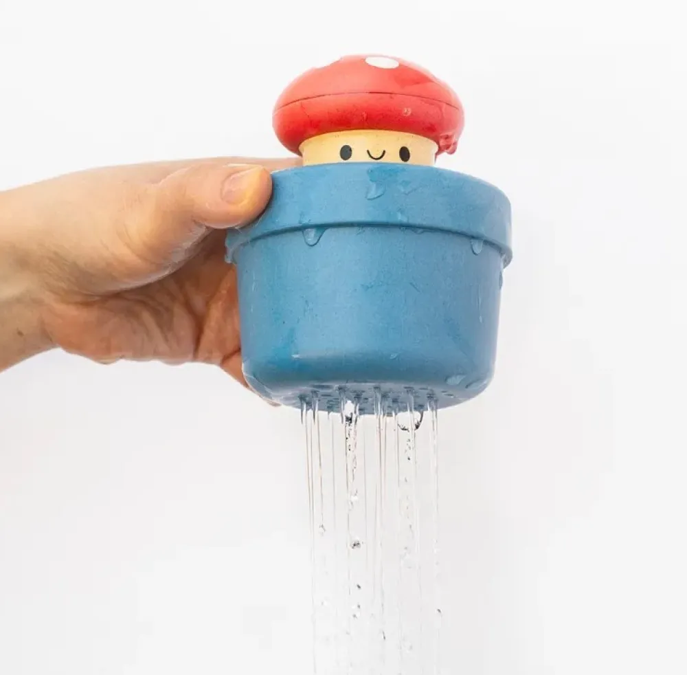 This bath toy is even better in real life than we thought it would be, the pot is easy to hold and made of bioplastic* making it very tactile. It will bob round on the top of the water when closed, as you sink it, the mushroom lid starts to lift up and the face appears as it fills the pot with water, through the holes in the base. When its full, if you let it go, the face bobs above water level, when you lift it out of the water, it will rain water down for several seconds emptying with the face disappearing the the mushroom lid closing back down. Lots of fun in the bath or water.
