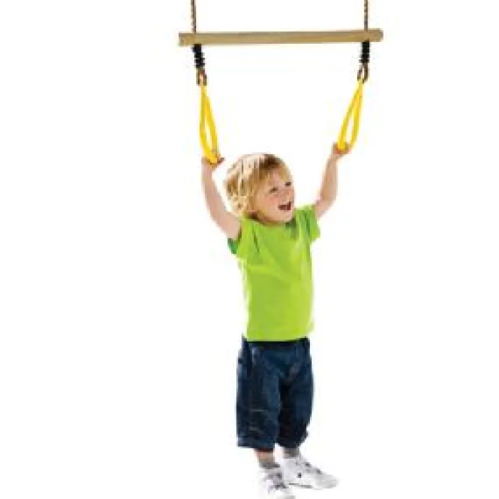 Practice your somersaults, hanging upside down or gymnastics. This Trapeze bar and rings are designed for children’s hands, everything is very smooth and rounded for easy hold, the handles are quite narrow for little fingers to grip well and the Poly Hemp ropes are synthetic so they wont rot but they look and feel natural and wont fray and splinter. The ropes are also adjustable so there is no excuse for mum and dad not to show off their skills. Tops of the ropes have a galvanized ring for fixing to your swing. If you are unsure what attachments to get for your swing, these are the one to go for, they can be used in so many ways and for lots of different ages and abilities. Little ones just love to see how long they can hold onto the rings with their feet off the floor and because of the bar, the rings dont move out over.