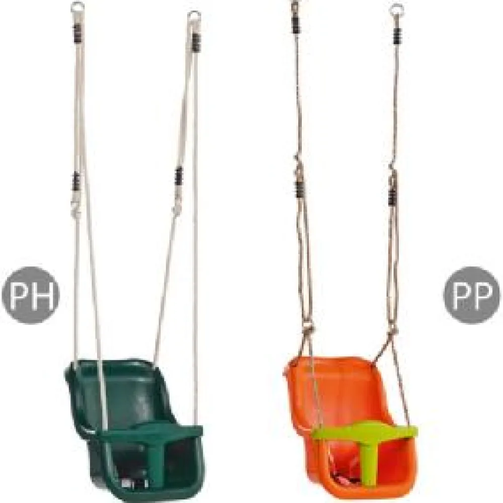 A high back baby seat with lifting front T bar, adjustable Poly Hemp ropes and safety harness, at the top of the ropes there are galvanized steel rings to allow you to fasten it to your attachment on your swing frame.