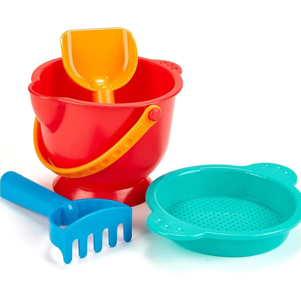 A set of good strong basics you need in a sand pit or at the beach. The bucket has a nice rounded handle and a pouring spout and tipping lug to make it easier to control your pouring. A large sieve with grips on either side ensure you have cleared all the shells out of your sand and a handy rake and spade ensure you can have lots of fun. Age 18 months +