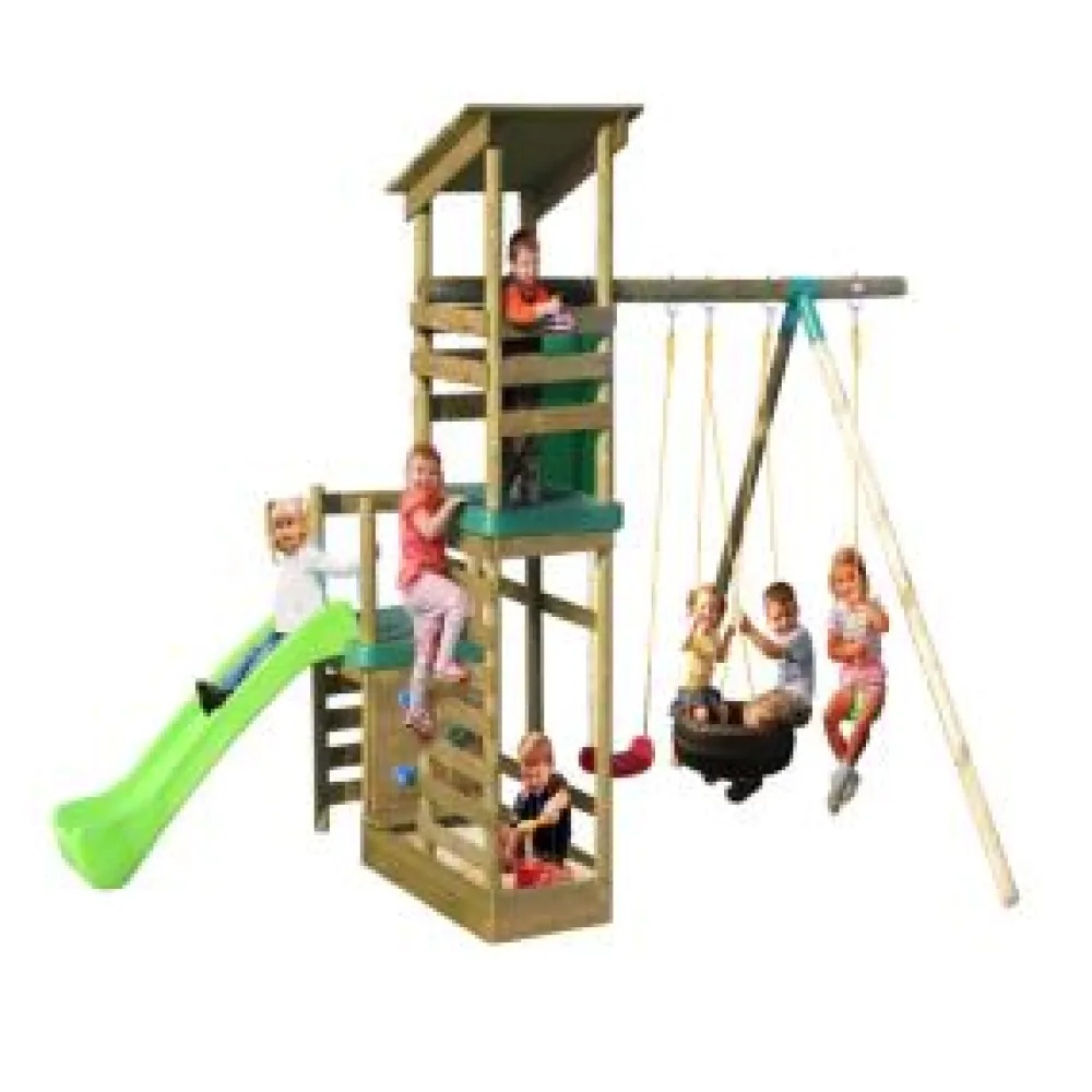 Do you want to climb, swing, slide or play in the sand pit, the choice is yours as this wooden frame has all these together. The main frame has 2 platforms with a 180cm slide off the lower platform and a sandpit with water proof cover and ground cover under the higher platform and the swing comes with a single seat, a plastic tyre swing for 2 children and a disk seat on the end. It also has an anchor kit to secure it and there is warranty on parts and the wood against rot and decay. Maximum users 6. Age 3+ These are delivered straight from the factory and this takes 10 – 14 working days, the couriers will ring you to arrange the delivery date.