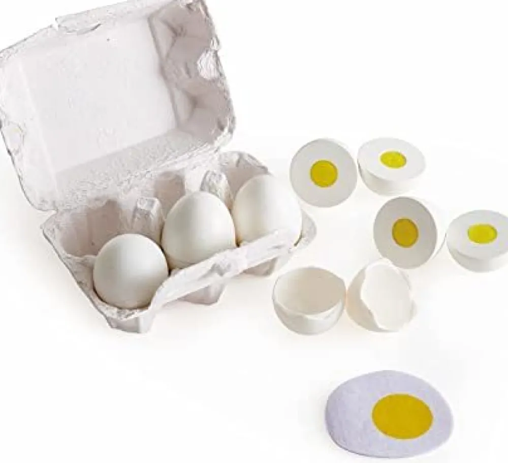 Open three of the eggs and you will find them hard boiled inside with a Velcro fastening. Open the other three to find a raw or sunny side up fried felt egg inside.