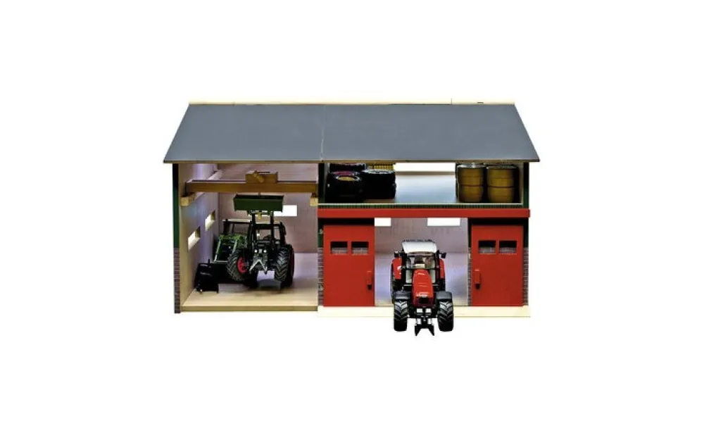 A wooden machinery workshop with overhead crane, plenty of space for working on machines and extra storage upstairs for all those parts. The main shed is split into a large open area with fold back roof and an over head crane which can slide forwards and back to move the heavy parts round the workshop. The other half has sliding double doors on the front of the shed, a folding roof and loft storage for all your tools, spare dual wheels and anything else you need keeping out of the way. Age 3+ 1:32 scale