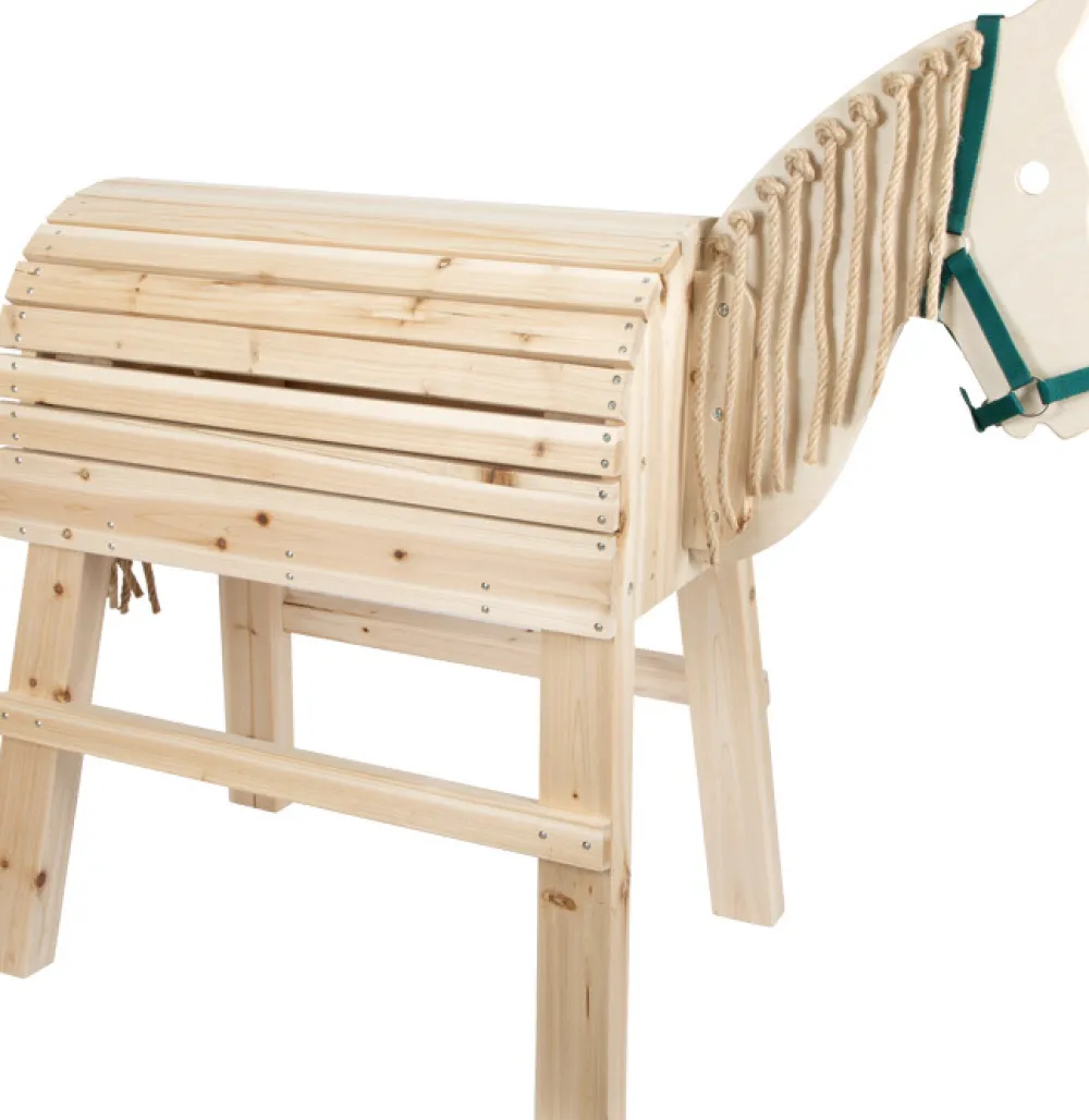 The horse’s back is designed in such a way thatreal saddlescan fit on it andmultiple children can fit on it. It’s ideal for the garden or yard, or even the nursery!For longer use, the untreated wood can be painted with a wood preserving varnish however one wants. Whether it’s the chestnut, the white horse, or the black horse – customers are free to design it how they wish. This riding pony isperfect for childhood role-playing. It makes children active with free andimagination-inspiring play opportunitiesand allows them to bring the horse play to life with their own creativity. There’s no integrated technology that plays sounds when the kids press a button – they’ll have to make their own whinnying sounds and clip-clopping of hooves!
