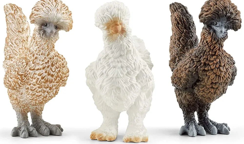 A collection of three fluff chickens, Polish and Silkie hens ready to cluck round your yard or across your desk.