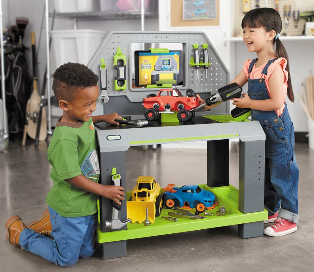 A garage full of parts to build your own vehicles, this garage workshop comes with 3 vehicles to build and lots of tools to help you. Once you have built the vehicles start mixing the parts up to create your own hybrids. The workbench also come with a free downloadable app that brings your vehicle to life as you build it and lets you play games and test your mechanical expertise. Tools include, battery powered drill with 3 changeable bits, 2 screw drivers, tape measure, socket set, pillars, adjustable spanner, spirit level and hammer. 3-5 years