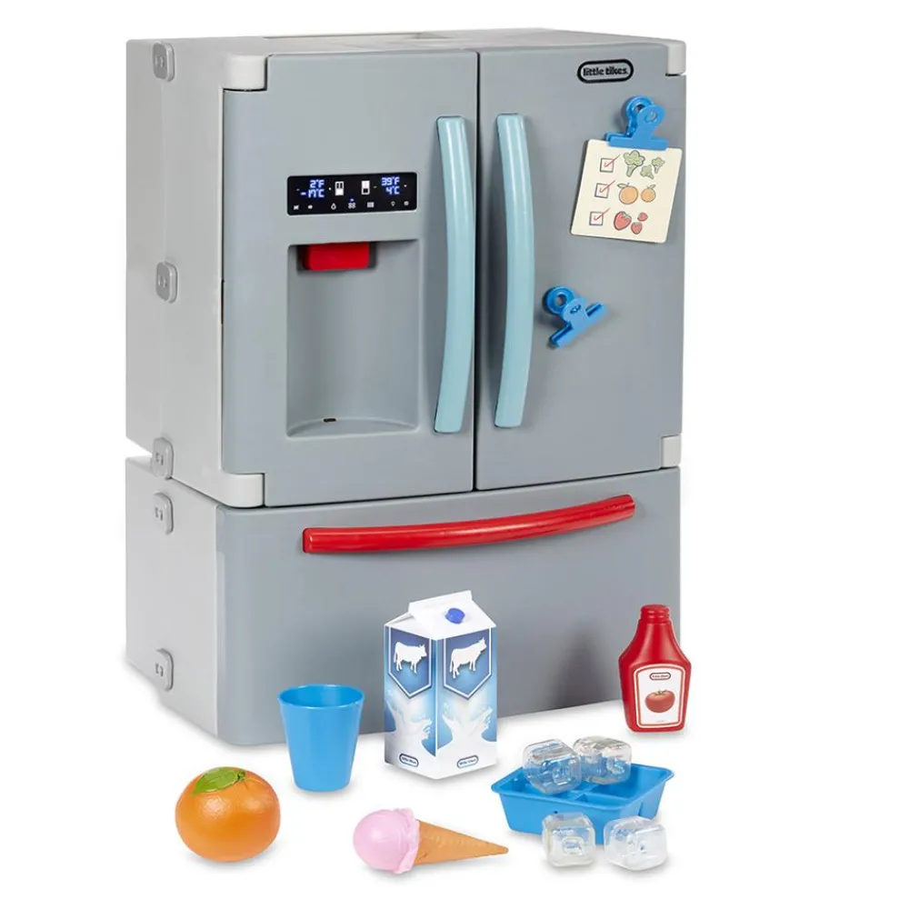 Little ones can pretend to cook and prepare food just like the grown ups with the super realistic Little Tikes First Fridge. This sleek, modern pretend play fridge is packed with interactive features: a working ‘ice’ dispenser, dual French doors, a separate freezer drawer, and working fridge lights. Plus, it makes realistic sounds like crushed ice, water dispensing, beeps, and more to really extend the pretend play for hours. Pretending to prepare food and do other chores helps kids gain a sense of responsibility, an important part of social-emotional learning. The First Fridge is easy to set up to its full size, and fits all 11 included accessories for easy clean up too. Kids can even customise it by displaying their grocery lists or artwork on the door. Encourage kids to engage in imaginative pretend play with the First Fridge by Little Tikes. Age 2- 3 years