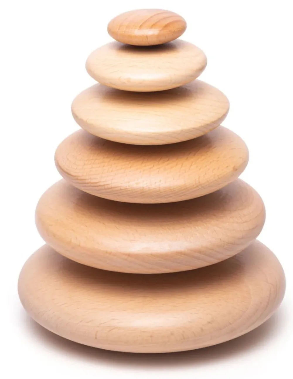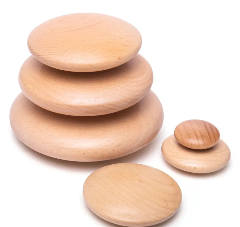 A collection of stacking pebbles, these wonderfully smooth tactile wooden discs are designed to be stacked in various ways and options. A classic to Montessori toy. Easy to stack and stay built even on an angle.