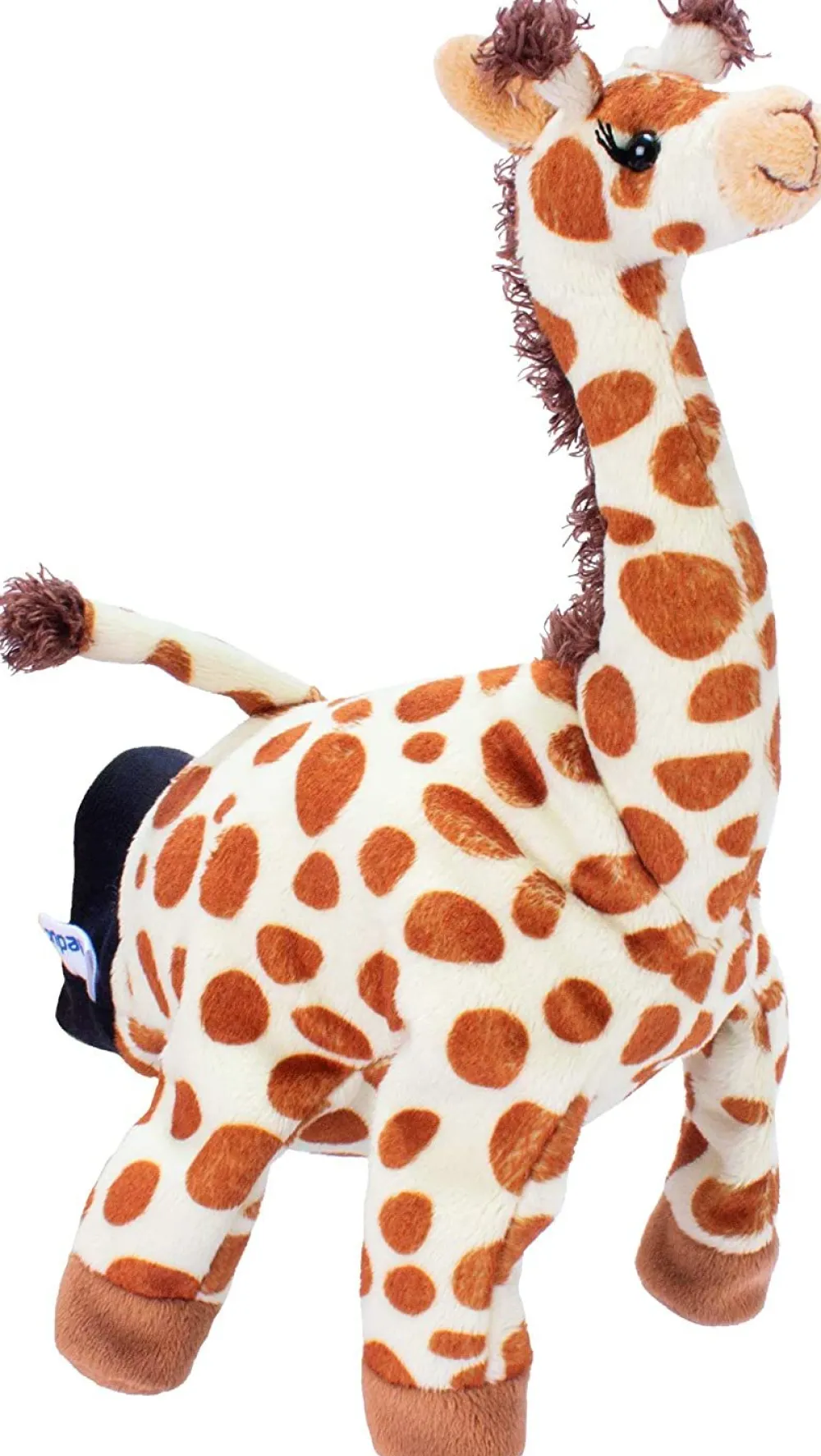 A friendly Giraffe with a long neck, big eye lashes, a soft mane, swishing tail and four independently moving legs.