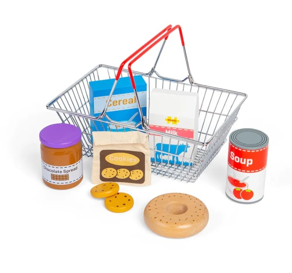 In your shopping basket you have collected a wooden box of cereal, a wooden carton of milk, a wooden tin of soup, a wooden jar of chocolate spread, a material bag with 2 cookies and a wooden donut or bagel.