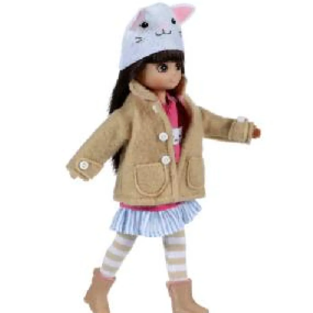 A lovely lifelike doll with removable clothes that is small enough to go everywhere with you but perfect size for little hands to undress and redress on their own, with well made clothes in different fabrics that are easy to get on and off, such as slits in the back of the wellies and lots of velcro. She has a child shaped body and can stand on her own feet. This doll comes with removable boots, tights, skirt, T shirt, coat and hat. Age 3+