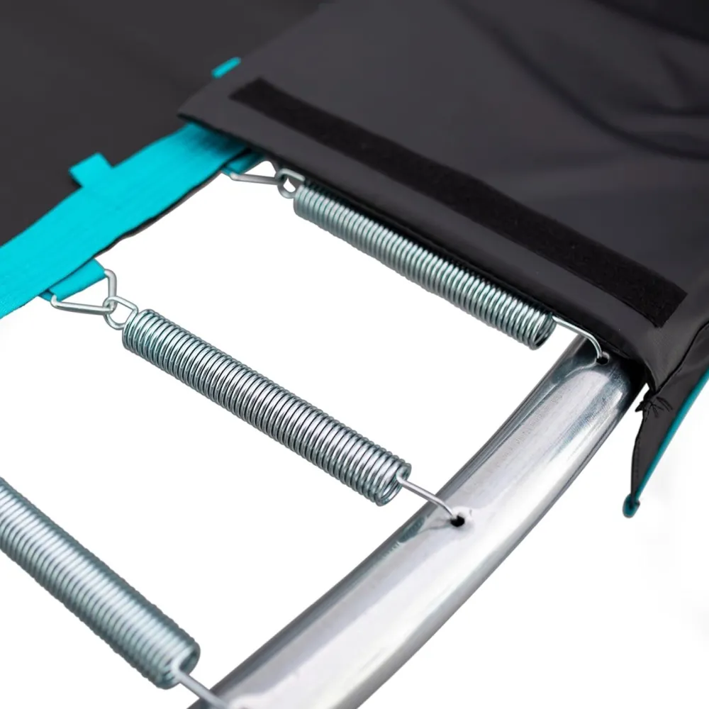 A great trampoline with a net which is very easy to drop down or raise. This strong trampoline has an igloo door passage for entry and exit, meaning no door zip in the net, which helps increase its life span. The extra long strong springs give a great bounce and the UV protected bounce mat also increases its life span. The 30mm pads which cover the whole of the springs, giving full protection along with the surround safe net. When you want to drop the net, unhook it from the net legs and fold the net legs down on top of the net, this takes an adult on their own less than a minute to do and the same to put back up.
