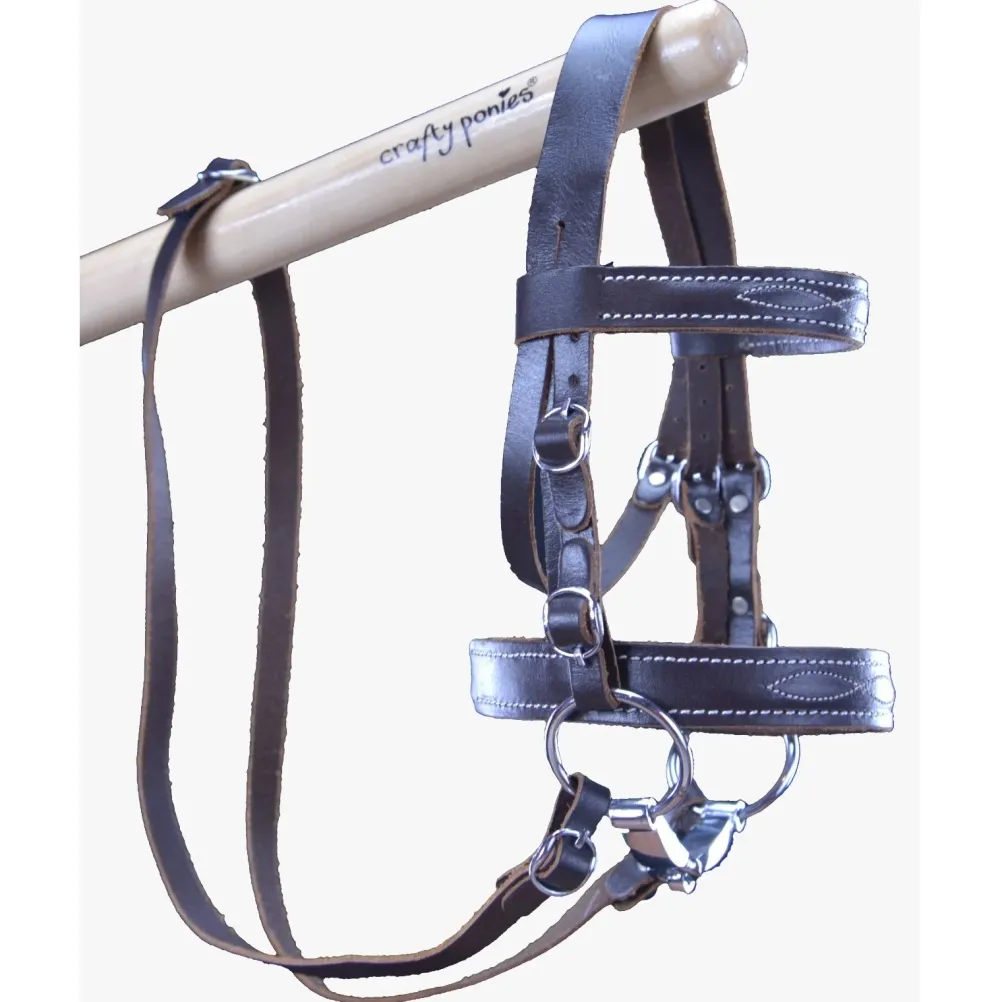 A leather bridle with detailed white stitching for your Crafty Ponies Hobby Horse, this detailed bridle is an replica of a real pony bridle, including a snaffle bit, adjustable cheek straps, standard leather brow band and throat lash. It comes with a booklet which tells you all about your bridle, how to adjust it to fit your Hobby Horse and how to take it apart and put it back together it when you need to clean it.The Bridle also comes with a sparkly crystal brow band to add some bling to your Hobby Horse, just swap it over, once you learn how to take your bridle apart and replace it with your sparkly brow band.