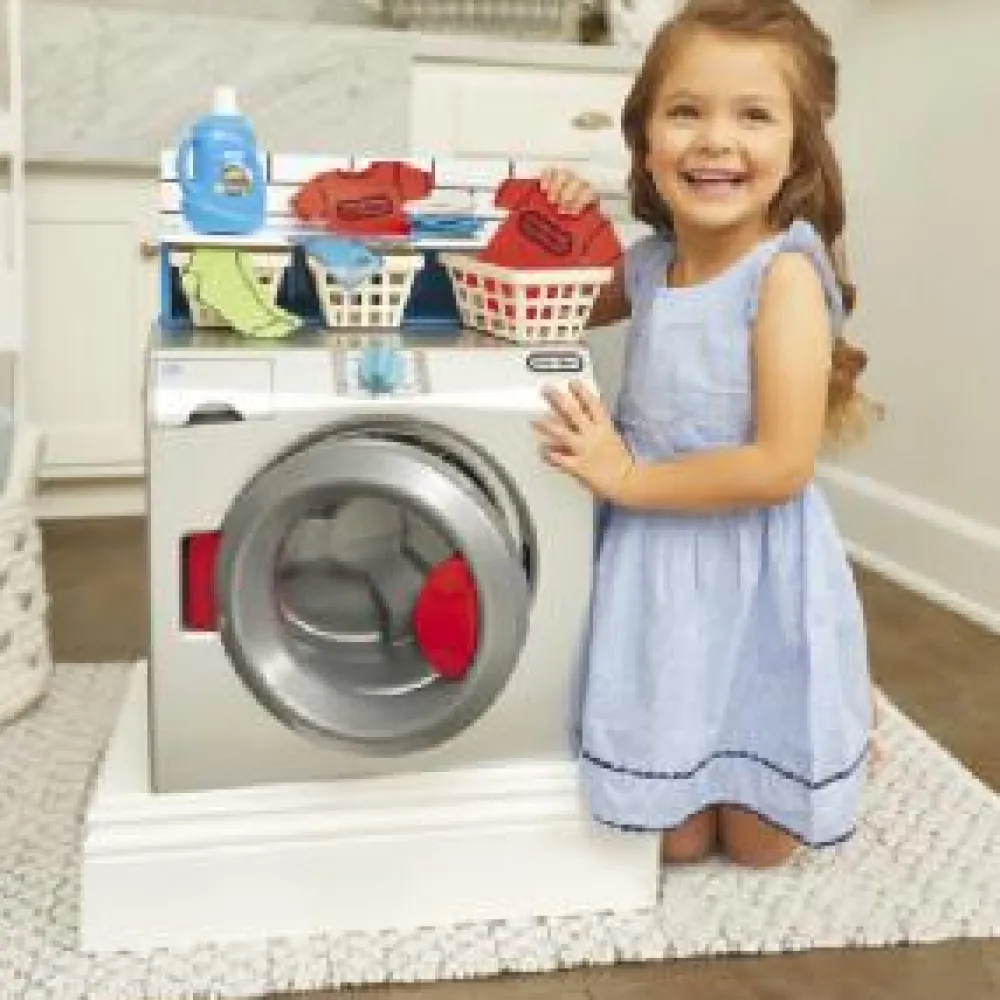Little ones can pretend to wash and dry clothes just like the grown ups with the super realistic Little Tikes First Washer-Dryer. This sleek, modern pretend play washer-dryer is packed with interactive features: a tumbling drum, a sliding detergent drawer, a tabletop for folding clothes, and built-in slots for storage baskets. Plus, it makes realistic sounds like dials turning, spinning drum sounds, beeps, cycles changing, and more to really extend the pretend play for hours. Pretending to do laundry and other chores helps kids gain a sense of responsibility, an important part of social-emotional learning. The First Washer-Dryer is easy to set up to its full size, and fits all 11 included accessories for easy clean-up too. Encourage kids to engage in imaginative pretend play with the First Washer-Dryer by Little Tikes!
