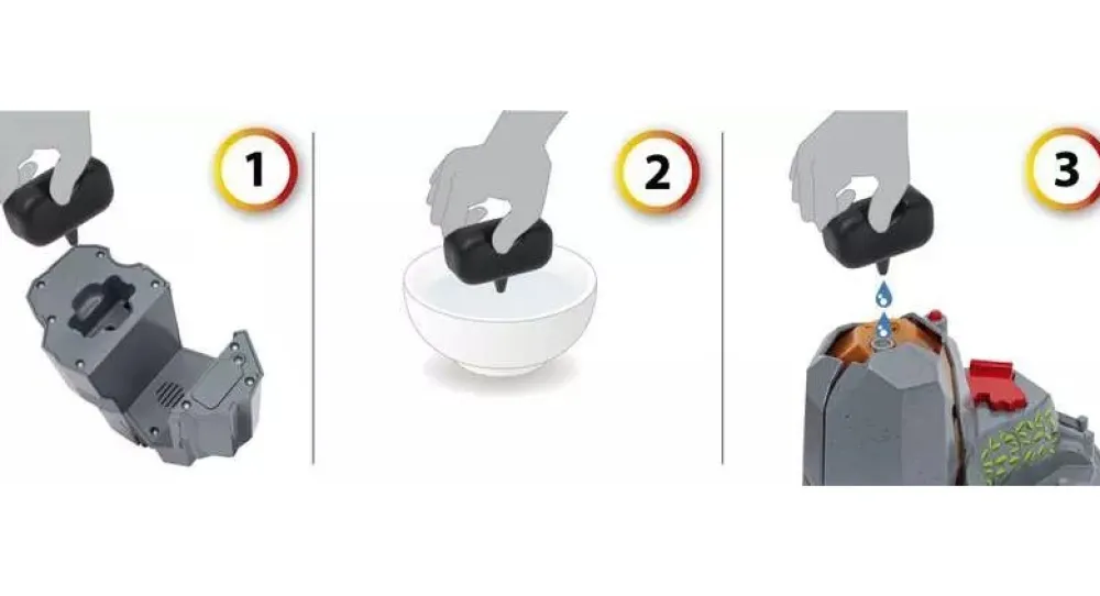 As with the steaming train the cold steam is created from cold water and has no heat at all and is safe to put your hand in, the refill capsule fits into the base. The volcano vents large quantities of visible steam when you press the button at the top of the volcano, it also makes the lava lights glow and the volcano make sounds. If T rex stands on the platform near the top, he will activate the sides of the volcano to fall off, as well as lights, steam and sounds. ThePteranodon has a magnetic section allowing it to pick up the eggs and carry them to safety or drop them onto a passing carriage to be transported away.